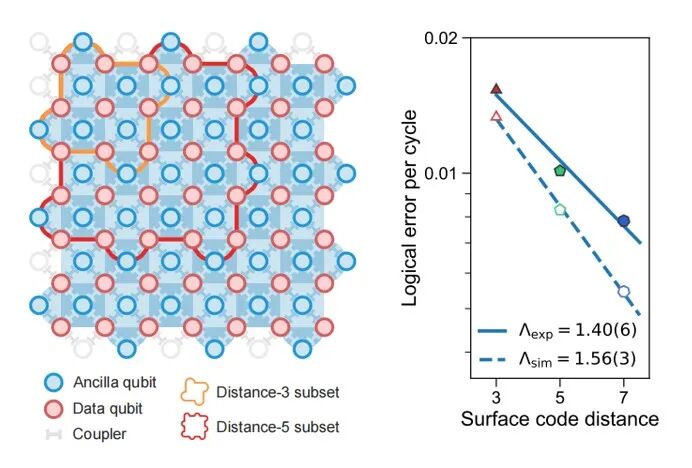 ▲左:随着码距增从3(橙色框内比特)增大到5(红色框内比特)再到7(所有彩色标注比特),右:逻辑错误率指数下降(图片来源:中国科学技术大学)